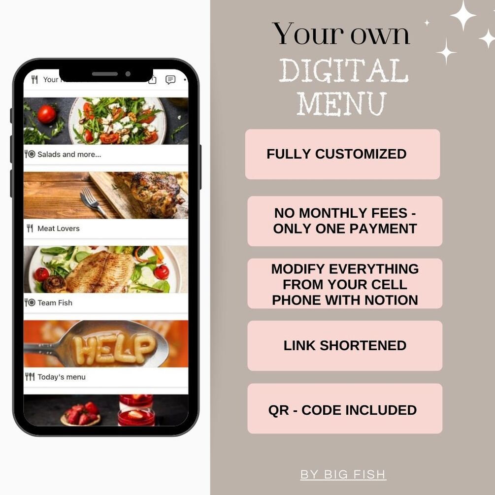 DIGITAL MENU - QR CODE INCLUDED - FULLY CUSTOMIZED - NO MONTHLY FEES - ONLY ONE PAYMENT - MODIFY EVERYTHING FROM YOUR CELL PHONE WITH NOTION - SHORT LINK INCLUDED